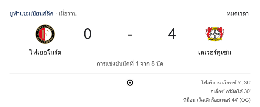 การแข่งขันยูฟ่าแชมเปียนส์ลีก 2024 รอบแบ่งกลุ่มนัดแรกระหว่าง เฟเยนูร์ด ร็อตเธอร์ดัม และ ไบเออร์ เลเวอร์คูเซิน ที่สนามของเฟเยนูร์ด จบลงด้วยชัยชนะของเลเวอร์คูเซิน 4-0 ทำให้พวกเขาประเดิม 3 แต้มแรกได้อย่างสวยงามในศึกใหญ่ครั้งนี้ บ้านกีฬา รายงานว่าเกมนี้เป็นการแสดงฟอร์มที่สมบูรณ์แบบของเลเวอร์คูเซิน ที่สามารถจัดการเจ้าบ้านได้อย่างหมดจดตั้งแต่ต้นเกมจนจบ