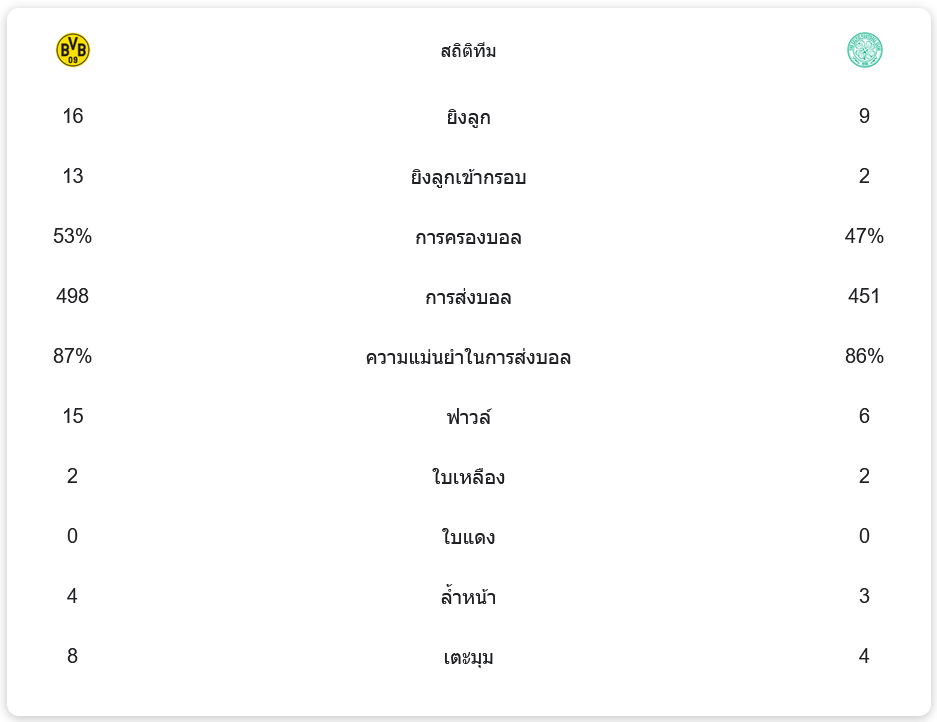 จากการครองบอล ดอร์ทมุนด์ มีการครองบอลอยู่ที่ 53% เหนือกว่า เซลติก ที่ 47% ทั้งนี้ ดอร์ทมุนด์มีโอกาสยิงทั้งหมด 16 ครั้ง โดยเป็นการยิงเข้ากรอบ 13 ครั้ง ขณะที่ เซลติกยิงได้ 9 ครั้งและเข้ากรอบเพียง 2 ครั้งเท่านั้น นอกจากนี้ ดอร์ทมุนด์ยังมีการผ่านบอลถึง 498 ครั้ง ด้วยความแม่นยำ 87% ขณะที่เซลติกผ่านบอล 451 ครั้งและมีความแม่นยำ 86%