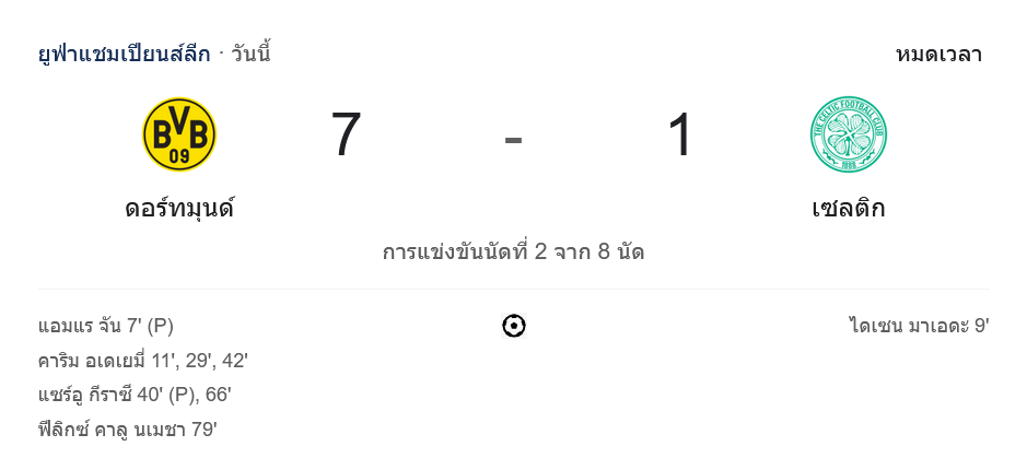 - นาทีที่ 79: ฟิลิกซ์ คาลู นเมซา ยิงปิดท้ายให้ดอร์ทมุนด์ 7-1