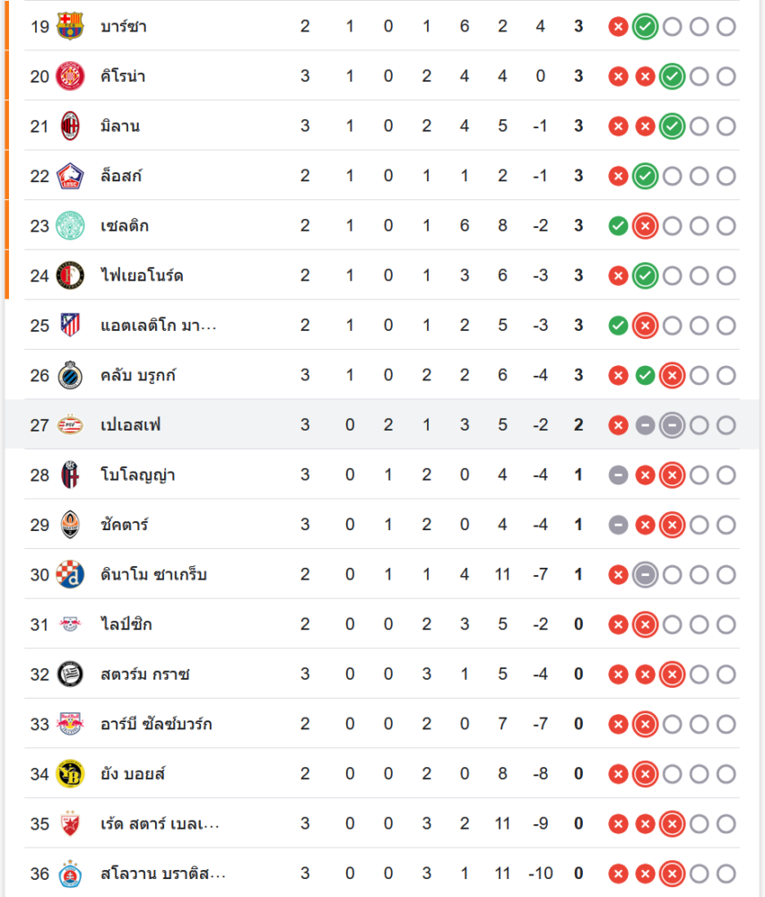 หลังจากผลเสมอในเกมนี้ ปารีส แซงต์ แชร์กแมง ขยับขึ้นมาอยู่อันดับที่ 17 ของตารางคะแนน มี 4 แต้มจาก 3 นัด ขณะที่ พีเอสวี ไอนด์โฮเฟ่น ยังคงอยู่ที่อันดับ 27 มี 2 แต้มจาก 3 นัด