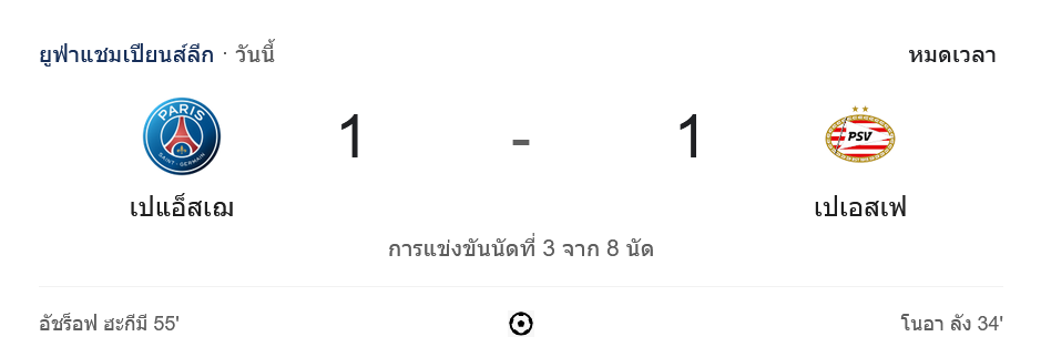 การแข่งขันฟุตบอล ยูฟ่า แชมเปี้ยนส์ ลีก 2024 นัดที่ 3 ของรอบแบ่งกลุ่ม ระหว่าง ปารีส แซงต์ แชร์กแมง เปิดบ้านพบกับ พีเอสวี ไอนด์โฮเฟ่น จบลงด้วยผลเสมอ 1-1 ที่สุดดราม่าตลอดทั้งเกม แม้ว่าเปแอสเชจะครองบอลและบุกมากกว่า แต่พีเอสวีก็มีการจัดการเกมรับอย่างเหนียวแน่น คว้าแต้มสำคัญไปได้จากเกมเยือนครั้งนี้