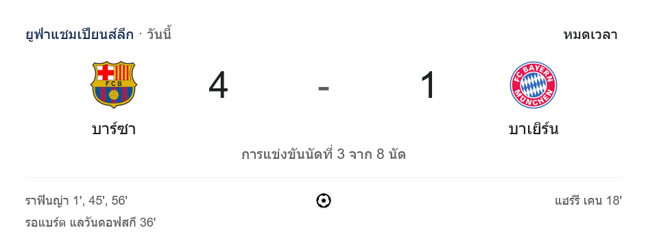 - ⚽ 45′ – ราฟินญ่า ยิงเพิ่มให้บาร์เซโลน่านำ 3-1 จากการจ่ายของ มาร์ก คาซาโด้