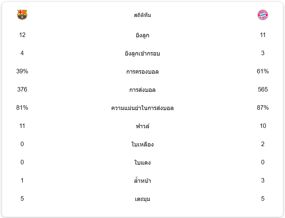 สถิติการแข่งขัน: บาเยิร์นครองบอลเหนือกว่า แต่บาร์ซ่าเฉียบคม