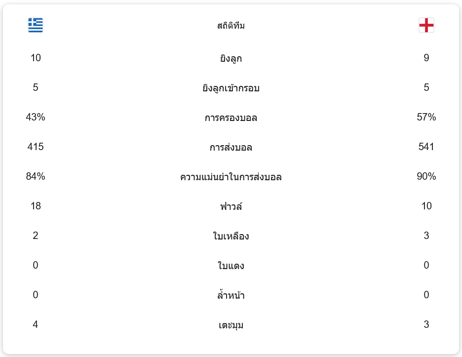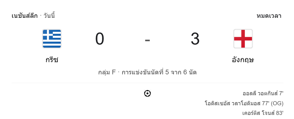 - ⚽️ นาทีที่ 77: โอดิสเซอัส วลาชอดิมอส ทำเข้าประตูตัวเอง ส่งให้อังกฤษนำ 2-0