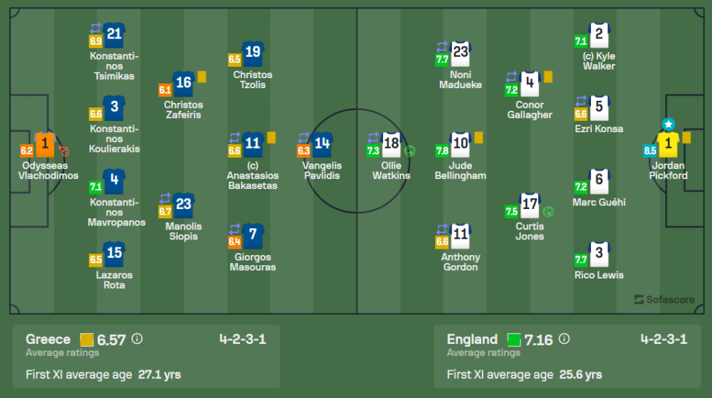 ทีมชาติอังกฤษมาในระบบ 4-2-3-1 ที่เน้นการบุกริมเส้นจาก โนนี่ มาดูเอเก้ และ แอนโธนี่ กอร์ดอน ซึ่งเปิดพื้นที่ให้ โอลลี่ วัตกินส์ เป็นหัวหอกเดี่ยวที่คอยจบสกอร์ ส่วนกรีซพยายามใช้แผนสวนกลับในระบบ 4-2-3-1 แต่กลับโดนเพรสซิ่งจากแดนกลางของอังกฤษจนเสียบอลบ่อยครั้ง ทำให้ไม่สามารถเจาะแนวรับของทีมเยือนได้