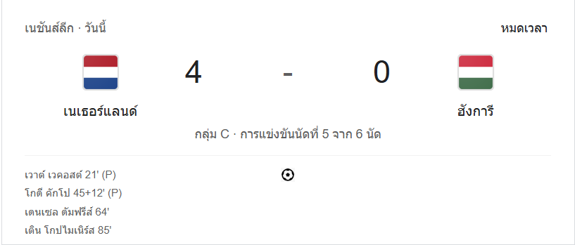 - นาทีที่ 90+4: ผู้ตัดสินให้เวลาเพิ่มอีก 3 นาที เนเธอร์แลนด์เล่นช้าเพื่อถ่วงเวลาและป้องกันสกอร์ ไม่ให้ฮังการีมีโอกาสกลับมาได้
