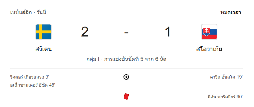 - นาทีที่ 90+8: ผู้ตัดสินเป่านกหวีดจบเกม สวีเดนเอาชนะสโลวาเกียไปได้ 2-1 จบเกมด้วยชัยชนะที่เต็มไปด้วยความดุเดือดและการเล่นที่มีความตึงเครียดตลอดทั้งเกม