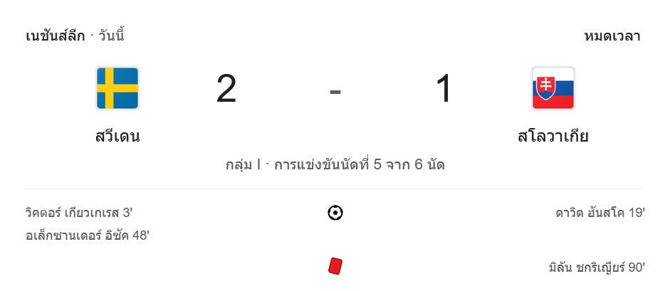 ⚽ 48′ อเล็กซานเดอร์ อิซัค ยิงประตูชัยให้สวีเดน