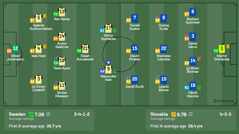 สวีเดนมาในแผน 3-4-1-2 ที่เน้นการครองบอลและโจมตีผ่านกลางสนาม โดยมีเดยัน คูลูเซฟสกี้เป็นตัวสร้างสรรค์เกมรุก อเล็กซานเดอร์ อิซัคและวิคเตอร์ เกียวเกอเรสเป็นคู่หน้าที่ประสานงานกันได้อย่างลงตัว ส่วนสโลวาเกียเลือกใช้แผน 4-3-3 ที่เน้นการรับและโต้กลับเร็วผ่านปีกซ้ายและขวา แต่ก็ไม่สามารถต้านทานเกมบุกที่หลากหลายของสวีเดนได้