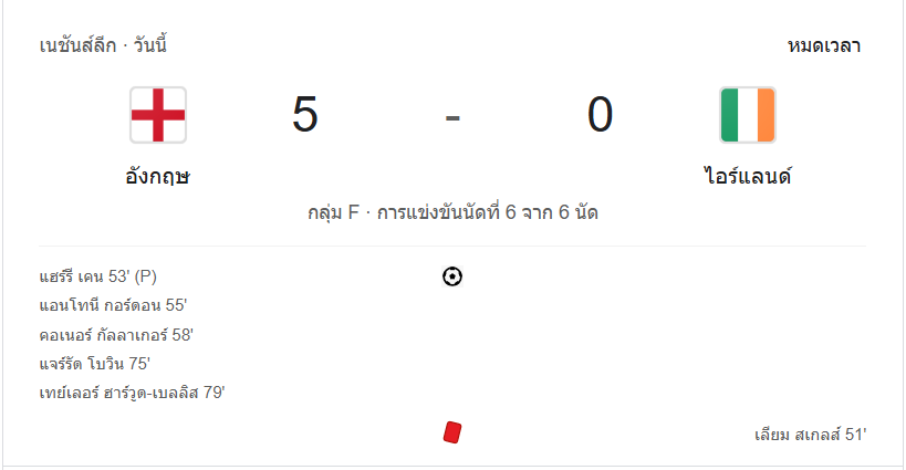 “ผลบอลสด” ของเกมนี้แสดงให้เห็นถึงความแข็งแกร่งและเหนือชั้นของทีมชาติอังกฤษที่เล่นในบ้าน พวกเขาสามารถเก็บสามแต้มสำคัญในศึกยูฟ่าเนชันส์ลีกครั้งนี้ได้แบบไร้ข้อกังขา ขณะที่ไอร์แลนด์ยังต้องกลับไปปรับแผนการเล่นเพื่อคืนฟอร์มในเกมถัดไป