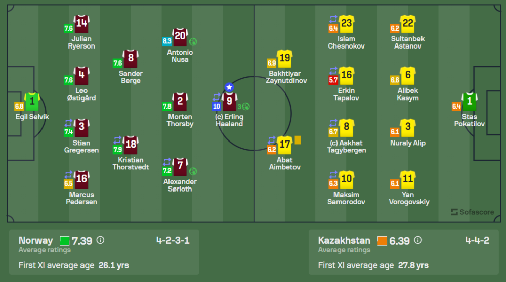 นอร์เวย์เลือกใช้แผน 4-2-3-1 โดยให้ เออร์ลิง ฮาแลนด์ เป็นหัวหอกหลัก ขณะที่คาซัคสถานมาในแผน 4-4-2 เน้นเกมรับ แต่ไม่สามารถต้านทานการบุกของนอร์เวย์ได้ เกมรุกของนอร์เวย์ดุดันและมีการประสานงานที่ยอดเยี่ยม การครองบอลที่เหนือกว่าและการจ่ายบอลที่แม่นยำทำให้คาซัคสถานแทบไม่มีโอกาสทำเกมสวนกลับ