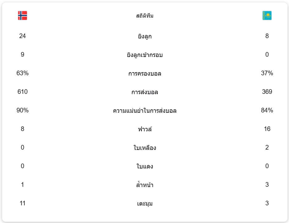 นอร์เวย์ครองบอลถึง 63% มีโอกาสยิงทั้งหมด 24 ครั้ง และยิงเข้ากรอบ 9 ครั้ง ส่วนคาซัคสถานครองบอลเพียง 37% ยิงทั้งหมด 8 ครั้ง แต่ไม่สามารถยิงเข้ากรอบได้เลย นอกจากนี้นอร์เวย์ยังทำเตะมุมได้ถึง 11 ครั้ง แสดงให้เห็นถึงความกดดันที่ใส่ให้กับคู่แข่งตลอดเกม