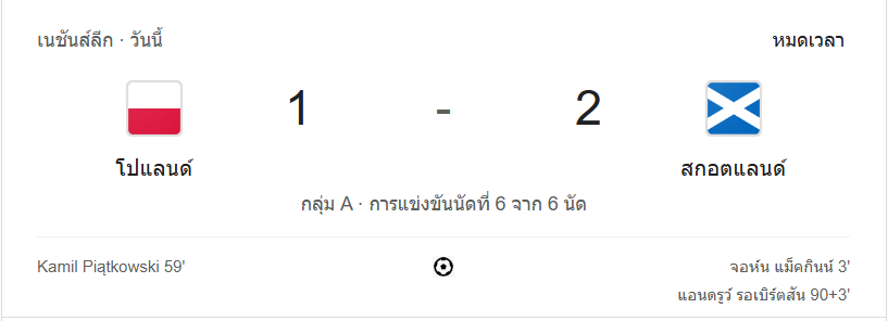 • นาทีที่ 90+4: โปแลนด์พยายามกดดันหนักในช่วงท้ายเกม แต่สกอตแลนด์ป้องกันได้ดี