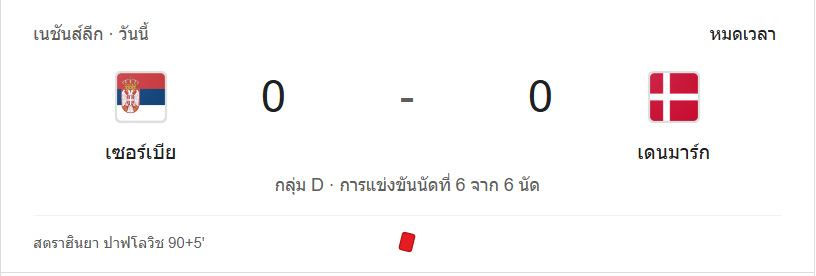- นาทีที่ 90: ผู้ตัดสินทดเวลา 5 นาที เซอร์เบียและเดนมาร์กยังคงทำเกมรุกแลกกันอย่างดุเดือด