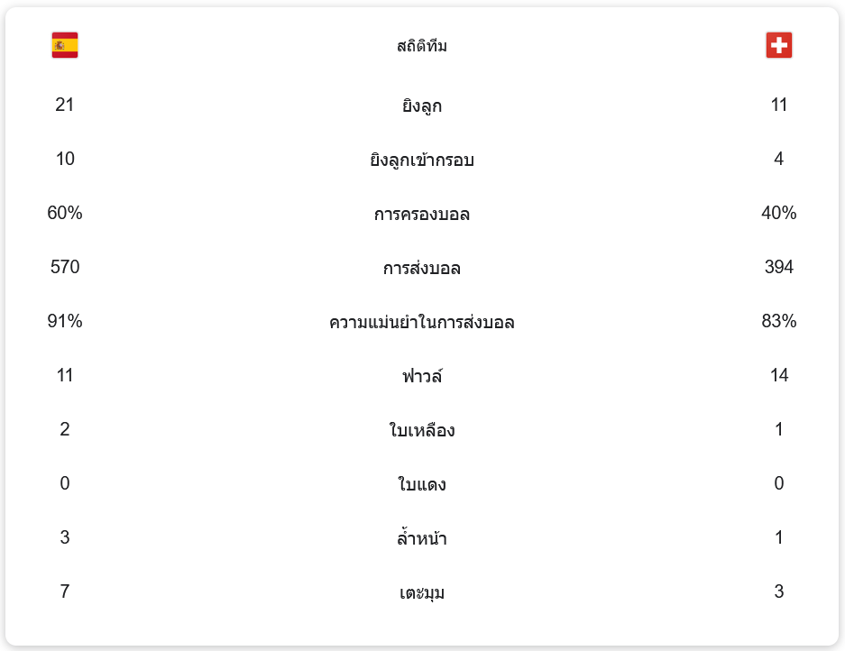สเปนสร้างโอกาสยิงได้มากถึง 21 ครั้ง โดยเข้ากรอบ 10 ครั้ง ขณะที่สวิตเซอร์แลนด์ยิงได้ 11 ครั้ง และเข้ากรอบเพียง 4 ครั้ง ความแม่นยำในการส่งบอลของสเปนสูงถึง 91% เทียบกับสวิตเซอร์แลนด์ที่ 83% แสดงให้เห็นถึงความเหนือกว่าชัดเจนของเจ้าบ้านในด้านการครองเกม