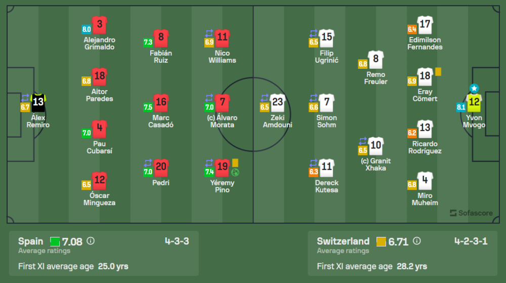 สวิตเซอร์แลนด์ เลือกใช้ระบบ 4-2-3-1 เน้นเกมรับและสวนกลับเร็ว แม้จะครองบอลน้อยกว่า แต่การโต้กลับของทีมเยือนสร้างความกดดันให้สเปนไม่น้อย ความแม่นยำในการจ่ายบอล 83% และเกมรับที่แข็งแกร่งช่วยให้ทีมยังคงอยู่ในเกมได้จนถึงช่วงท้าย