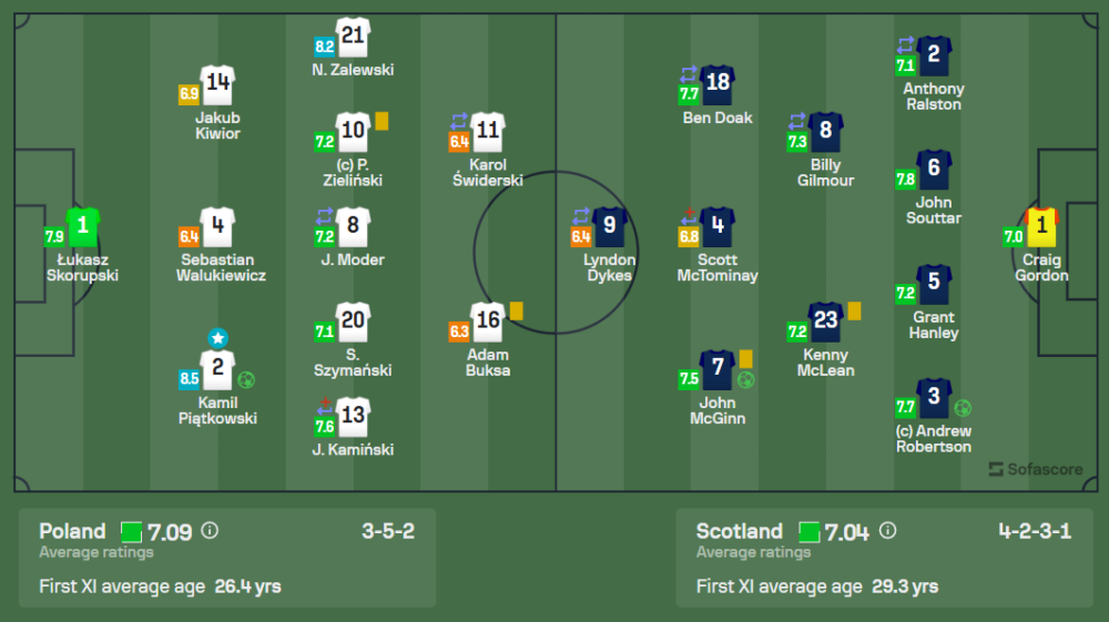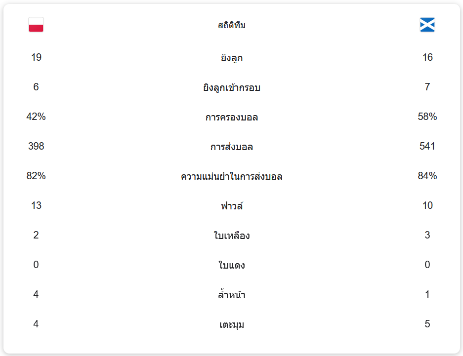 โปแลนด์มีโอกาสยิงทั้งหมด 19 ครั้ง เข้ากรอบ 6 ครั้ง ขณะที่สกอตแลนด์ยิงทั้งหมด 16 ครั้ง เข้ากรอบ 7 ครั้ง การครองบอลของสกอตแลนด์อยู่ที่ 58% เทียบกับโปแลนด์ที่ 42% สถิติการจ่ายบอลที่แม่นยำของสกอตแลนด์ 84% เหนือกว่าโปแลนด์ที่ทำได้ 82% แสดงถึงความได้เปรียบในการเล่นเกมกลางสนาม