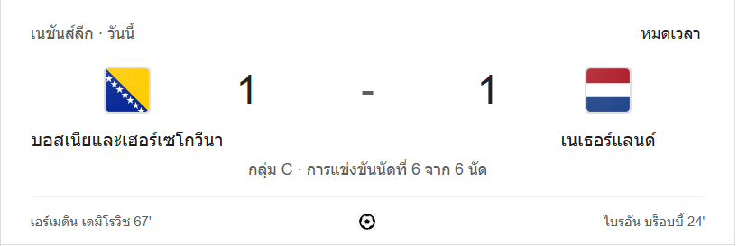 - นาทีที่ 94: จบเกมการแข่งขันที่ดุเดือดด้วยผลเสมอ บอสเนีย 1-1 เนเธอร์แลนด์