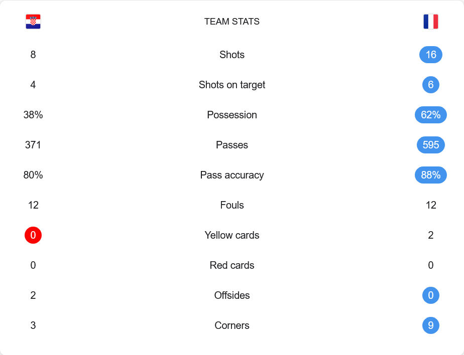 ฝรั่งเศสเป็นฝ่ายครองเกมมากกว่าด้วยเปอร์เซ็นต์การครองบอล 62% และจ่ายบอลแม่นยำถึง 88% ขณะที่โครเอเชียครองบอลเพียง 38% แต่มีประสิทธิภาพในจังหวะจบสกอร์มากกว่า แม้ว่าฝรั่งเศสจะมีโอกาสยิงถึง 16 ครั้ง (เข้ากรอบ 6) แต่ก็เจาะแนวรับของโครเอเชียไม่เข้าเลยแม้แต่ลูกเดียว ในขณะที่โครเอเชียมีโอกาสยิง 8 ครั้ง (เข้ากรอบ 4) และเปลี่ยนเป็น 2 ประตูเต็มๆ