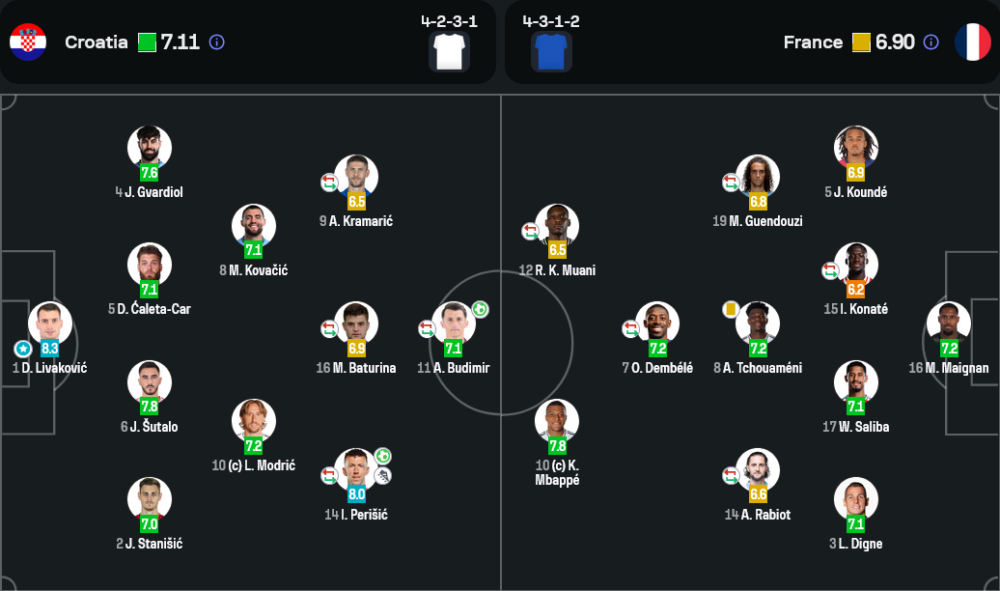 นายทวารโครเอเชีย โดมินิก ลิวาโควิช คว้ารางวัล Man of the Match ด้วยคะแนน 8.3 จากการเซฟสำคัญหลายครั้ง โดยเฉพาะลูกยิงของ เอ็มบัปเป้ และ เดมเบเล่ ที่ช่วยให้ทีมเก็บคลีนชีตได้สำเร็จ