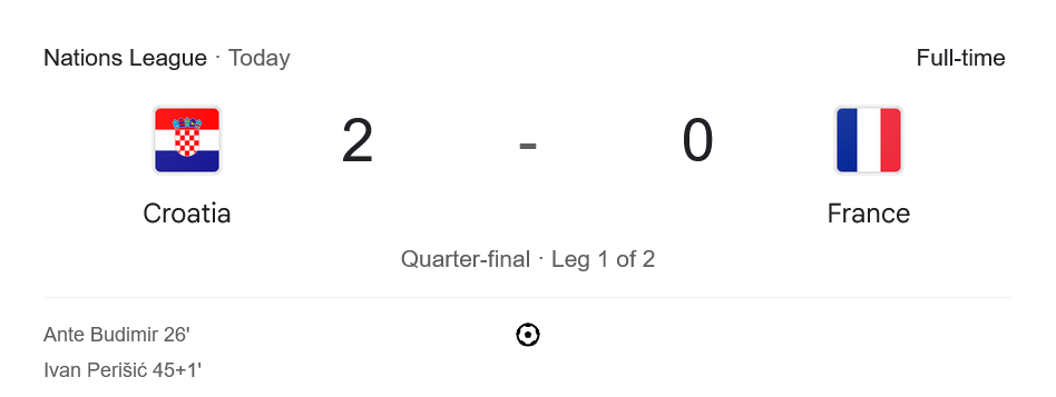 ศึก ยูฟ่า เนชั่นส์ ลีก 2025 รอบก่อนรองชนะเลิศ นัดแรก ปิดฉากลงอย่างสุดมันส์ โดย บ้านผลบอล รายงาน ผลบอลสด สุดเซอร์ไพรส์ เมื่อ โครเอเชีย โชว์ฟอร์มโหดเปิดบ้านอัด ฝรั่งเศส 2-0 จากประตูของ อันเต้ บูดิเมียร์ และ อิวาน เปริซิช พร้อมฟอร์มสุดยอดของ โดมินิก ลิวาโควิช นายด่านที่เซฟกระหน่ำจนคว้า Man of the Match ไปครอง