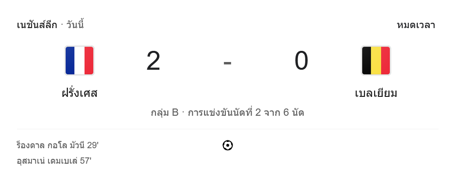 การแข่งขันฟุตบอลยูฟ่าเนชันส์ลีก 2024 นัดที่สองของกลุ่ม B ระหว่าง ฝรั่งเศส พบกับ เบลเยียม จบลงด้วยชัยชนะของฝรั่งเศสที่สกอร์ 2-0 โดยที่ฝรั่งเศสสามารถโชว์ฟอร์มอย่างแข็งแกร่งทั้งสองครึ่งและคว้าชัยชนะไปได้อย่างไม่ยากเย็น ทำให้พวกเขาคว้า 3 แต้มสำคัญและไต่ขึ้นมาอยู่อันดับที่ 2 ของกลุ่ม ขณะที่เบลเยียมต้องเผชิญกับความผิดหวังจากการพ่ายแพ้ในนัดนี้