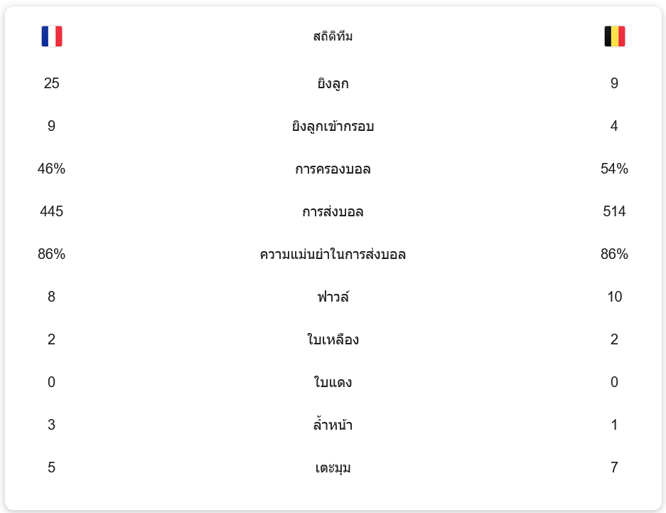 แม้ว่าเบลเยียมจะครองบอลได้มากกว่าที่ 54% แต่ฝรั่งเศสกลับเป็นทีมที่สร้างโอกาสในการยิงได้มากกว่า โดยมีโอกาสยิงถึง 25 ครั้ง และเข้ากรอบ 9 ครั้ง ขณะที่เบลเยียมมีโอกาสยิงเพียง 9 ครั้ง และเข้ากรอบเพียง 4 ครั้ง ความแม่นยำในการส่งบอลของทั้งสองทีมอยู่ในระดับสูง ฝรั่งเศสทำได้ 86% ส่วนเบลเยียมก็มีความแม่นยำที่เท่ากันที่ 86%