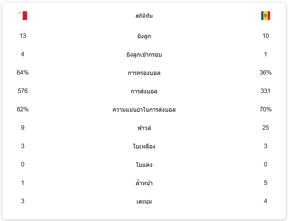 สถิติยูฟ่าเนชันส์ลีก 2024 ระหว่าง มอลตา 1-0 มอลโดวา