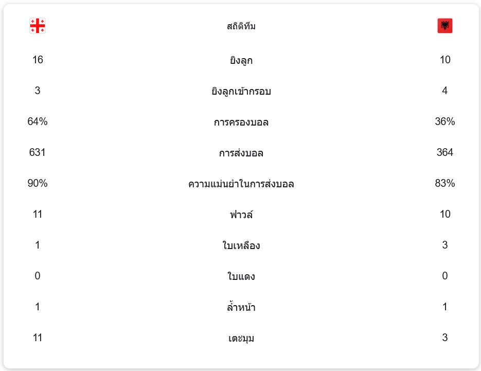 จอร์เจีย ครองบอลได้ถึง 64% แต่ไม่สามารถทำประตูได้จากการยิง 16 ครั้ง โดยเข้ากรอบเพียง 3 ครั้งเท่านั้น ขณะที่แอลเบเนียมีโอกาสยิง 10 ครั้งและเข้ากรอบ 4 ครั้ง ความแม่นยำในการส่งบอลของจอร์เจียอยู่ที่ 90% ส่วนแอลเบเนียอยู่ที่ 83% ทั้งสองทีมทำฟาวล์ 11 และ 10 ครั้งตามลำดับ