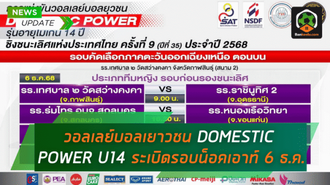 เดินทางมาถึงช่วงเข้มข้นของศึก วอลเลย์บอลยุวชน รายการ DOMESTIC POWER รุ่นอายุไม่เกิน 14 ปี ชิงชนะเลิศแห่งประเทศไทย ครั้งที่ 9 (ปีที่ 35) ประจำปี 2568 แล้ว โดยในวันที่ 6 ธันวาคมนี้ เป็นโปรแกรมรอบน็อคเอาท์โซนภาคตะวันออกเฉียงเหนือตอนบน เกมทุกแมตช์มีผลต่อการลุ้นตั๋วเข้าสู่รอบต่อไป ทีมไหนพลาดเพียงจังหวะเดียวอาจต้องเก็บกระเป๋ากลับบ้าน แรงกดดันทั้งจากโค้ช เพื่อนร่วมทีม และเสียงเชียร์ข้างสนาม ทำให้บรรยากาศทัวร์นาเมนต์ครั้งนี้เดือดไม่แพ้ระดับลีกอาชีพ