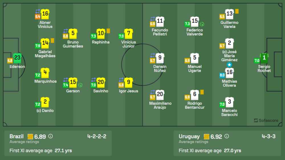 มาติอัส โอลิเวร่า ของอุรุกวัยได้รับรางวัล Player of the Match ด้วยคะแนน 8.0 จากผลงานการเล่นที่โดดเด่นในแนวรับ และช่วยให้ทีมสามารถยันเสมอบราซิลได้อย่างสมศักดิ์ศรี