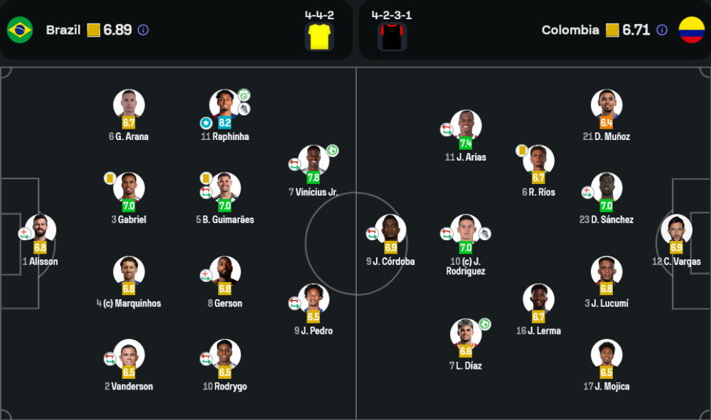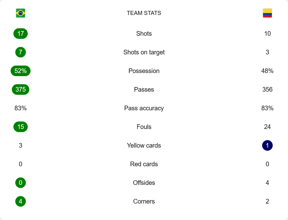 บราซิลครองบอล 52% โอกาสยิงมากกว่า 17 ต่อ 10 แต่โคลอมเบียมีการเล่นที่ดุดัน สร้างโอกาสจากเกมโต้กลับและวางใจให้ หลุยส์ ดิอาซ เป็นตัวปั่นป่วนแนวรับบราซิล