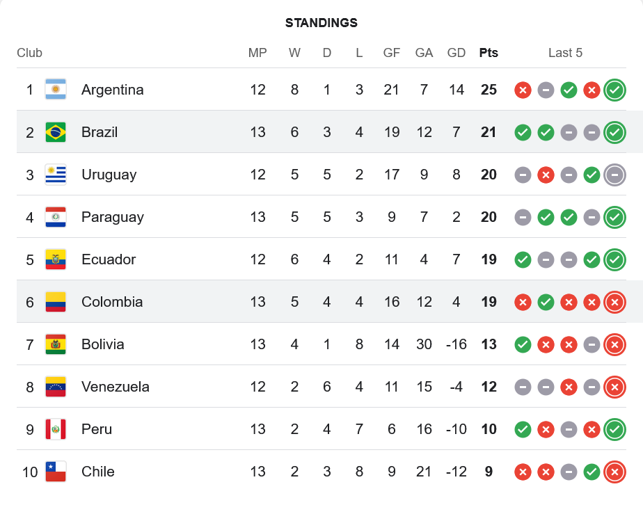 บ้านผลบอล นัดนี้ทำให้บราซิลขยับขึ้นมาเป็นรองจ่าฝูง มี 21 คะแนน ตามหลังอาร์เจนตินา 4 แต้ม ส่วนโคลอมเบียยังรั้งอันดับ 6 มี 19 คะแนน และยังต้องลุ้นหนักกับการแข่งขันที่เหลือ