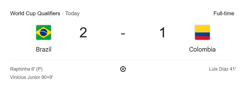 ⚽ 90+9′ – วินิซิอุส จูเนียร์ ยิงประตูชัยให้บราซิล 2-1 (แอสซิสต์: ราฟินญ่า)