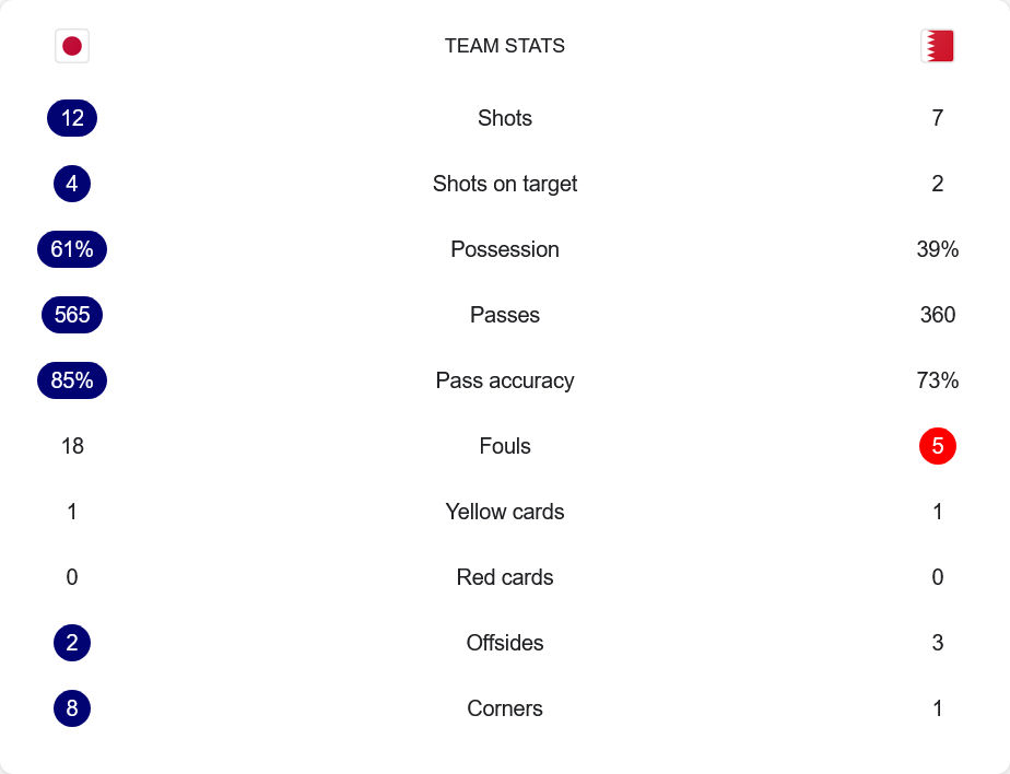 ญี่ปุ่นโชว์พลังเกมรุกด้วยการครองบอล 61% มีโอกาสยิงทั้งหมด 12 ครั้ง เข้ากรอบ 4 ครั้ง ขณะที่บาห์เรนมีโอกาสยิง 7 ครั้ง เข้ากรอบ 2 ครั้ง ญี่ปุ่นมีการจ่ายบอลทั้งหมด 565 ครั้ง ขณะที่บาห์เรนจ่าย 360 ครั้ง