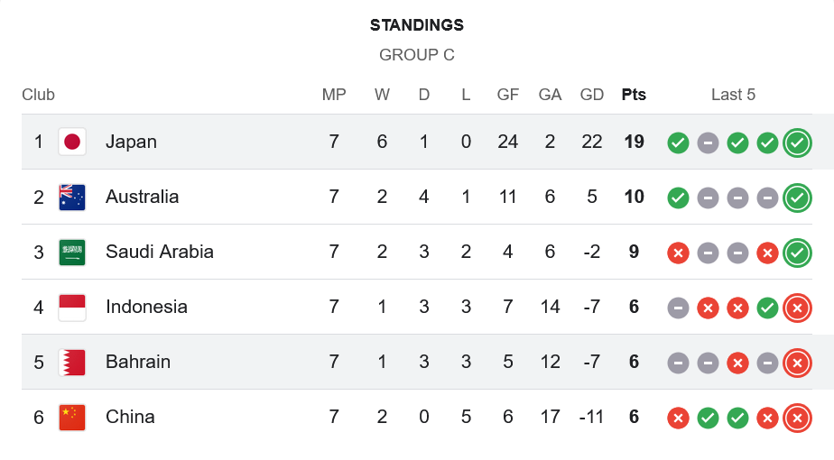 ชัยชนะของญี่ปุ่นทำให้พวกเขานำโด่งที่ 19 คะแนน จาก 7 นัด ทิ้งห่างอันดับ 2 ออสเตรเลีย (10 คะแนน) ส่วนบาห์เรนยังอยู่โซนท้ายตาราง มี 6 คะแนน เท่ากับจีนและอินโดนีเซีย