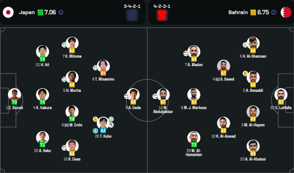 เกมนี้ญี่ปุ่นใช้แผน 3-4-2-1 เน้นการครองบอลและการเจาะพื้นที่ด้านข้างผ่าน คูโบะ และ มิโตมะ ซึ่งช่วยสร้างสรรค์เกมรุกได้อย่างยอดเยี่ยม ด้านบาห์เรนเล่นแผน 4-2-3-1 พยายามตั้งรับและสวนกลับ แต่การจบสกอร์ยังขาดความเฉียบคม