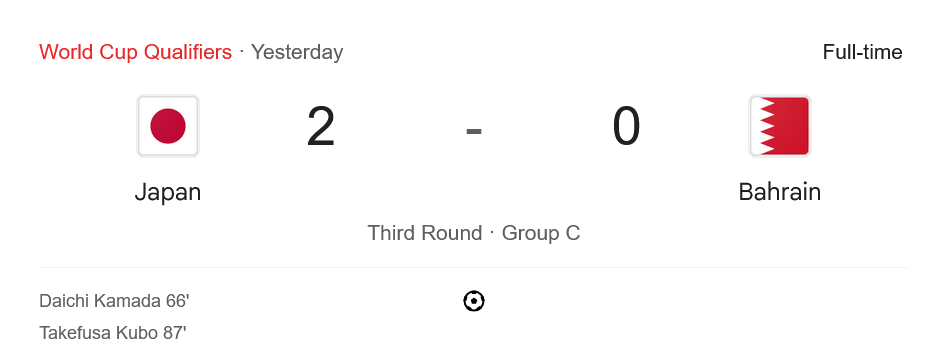 ศึกฟุตบอลโลก 2026 รอบคัดเลือก โซนเอเชีย ญี่ปุ่น ลงสนามดวลกับ บาห์เรน ในเกมสำคัญของ กลุ่ม C ซึ่งทีมเจ้าถิ่นหวังคว้าชัยเพื่อตอกย้ำความแข็งแกร่งของพวกเขาและการันตีตำแหน่งจ่าฝูง ผลบอลสด นัดนี้จบลงด้วยชัยชนะของ ซามูไรบลูส์ ที่อาศัยความเด็ดขาดในช่วงครึ่งหลัง กดไปสองเม็ดจาก ไดจิ คามาดะ และ ทาเคฟุสะ คูโบะ ส่งผลให้พวกเขาทิ้งห่างคู่แข่งในตารางแบบขาดลอย!