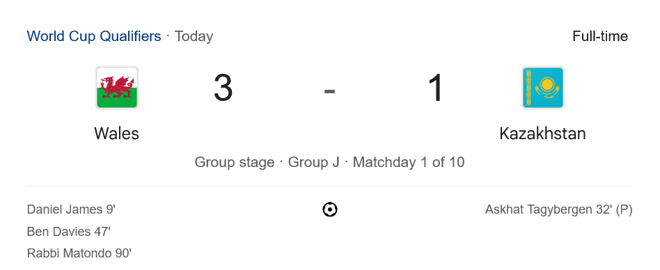 บ้านผลบอล สรุปหลังเกม มังกรผงาด! เวลส์อัดคาซัคสถาน 3-1 ประเดิมชัยคัดบอลโลก ฟุตบอลโลก 2026 รอบคัดเลือก