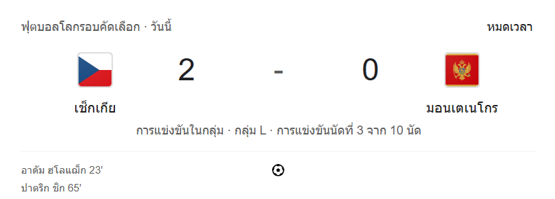 - หมดเวลาการแข่งขัน: เช็กเกีย 2-0 มอนเตเนโกร
