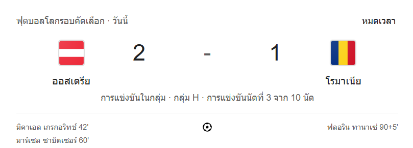• หมดเวลาการแข่งขัน: ออสเตรีย 2-1 โรมาเนีย เจ้าบ้านคว้า 3 แต้ม