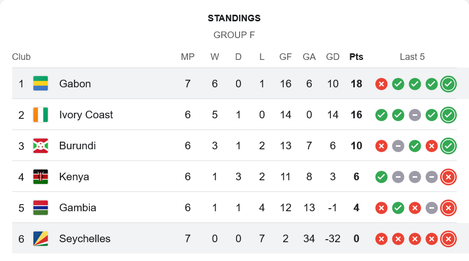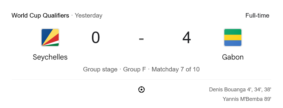 ชัยชนะนัดนี้ส่งกาบองขึ้นนำจ่าฝูงกลุ่ม เอฟ มี 18 คะแนนจาก 7 นัด แซงโกตดิวัวร์ที่ตามอยู่ 16 แต้ม ขณะที่เซเชลส์ยังจมบ๊วยแพ้รวด 7 นัด ยิงได้เพียง 2 เสียไปถึง 34 ประตู โอกาสเข้ารอบแทบหมดลงไปแล้ว