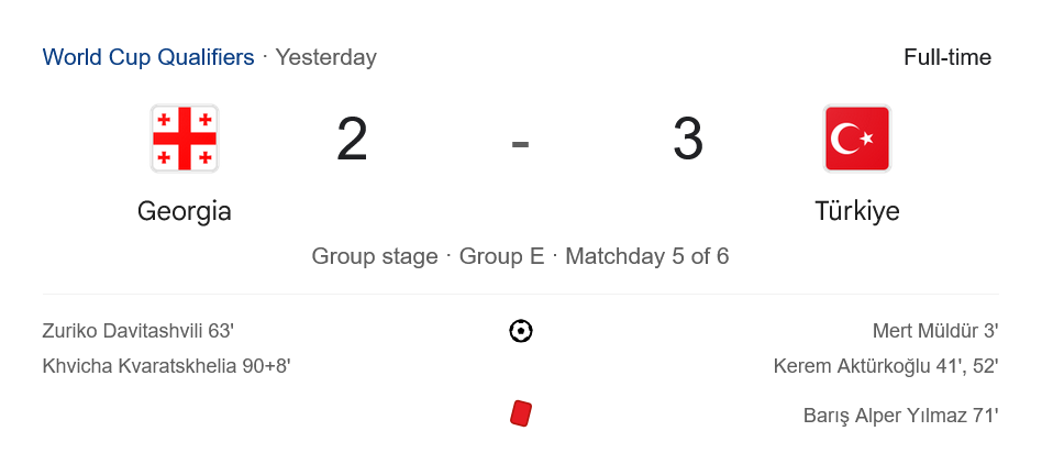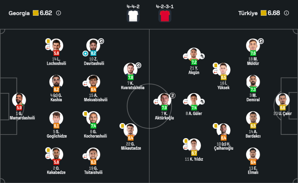 🟨 รวม: Lochoshvili 39’, Kakabadze 40’, Kochorashvili 73’, Kvaratskhelia 90+10’ (จอร์เจีย) / Yüksek 21’, Çalhanoğlu 90+10’ (ตุรกี)