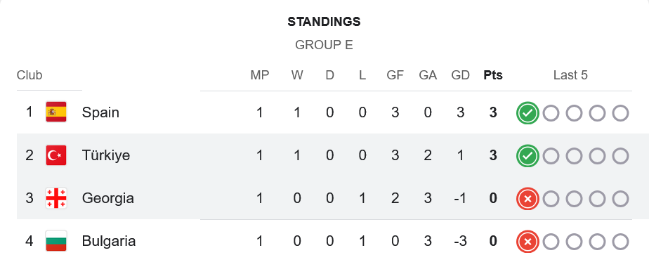 โปรแกรม ตารางบอล กลุ่ม E นัดต่อไป ตุรกีเจองานหนักเปิดบ้านรับสเปน วันที่ 8 กันยายน ส่วนจอร์เจียต้องออกไปเยือนสเปนในวันที่ 12 ตุลาคม เกมนี้จะเป็นตัวชี้ชะตาสำคัญของทั้งสองทีม
