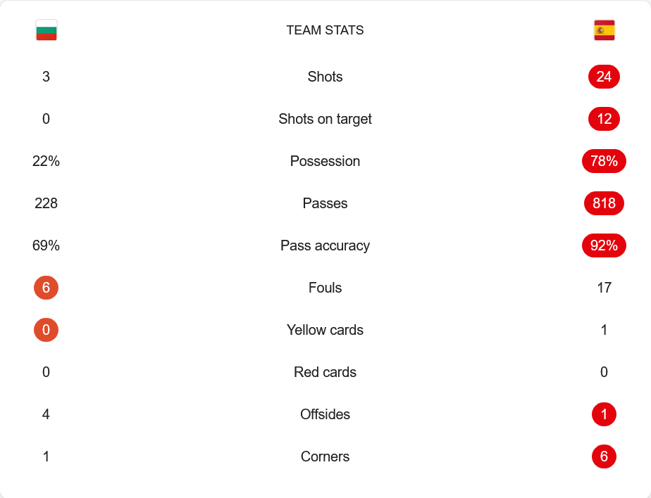 ตลอดทั้งเกม สเปนครองบอล 78% จ่ายบอลมากถึง 818 ครั้ง ความแม่นยำสูงถึง 92% ขณะที่บัลแกเรียมีโอกาสยิงเพียง 3 ครั้ง ไม่ตรงกรอบเลย ส่วนสเปนมีถึง 24 ครั้ง ตรงกรอบ 12 ครั้ง ฟาวล์รวม 23 ครั้ง (บัลแกเรีย 6, สเปน 17) ใบเหลืองมีเพียงฝั่งสเปน 1 ใบ แสดงให้เห็นถึงการคุมเกมแบบเบ็ดเสร็จของทีมเยือน