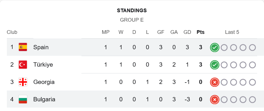 สามแต้มจากเกมนี้ส่งให้สเปนขึ้นนำกลุ่ม E มี 3 แต้มเต็ม ผลต่างประตู +3 เหนือกว่าตุรกีที่มี 3 แต้มเช่นกัน ส่วนบัลแกเรียยังไม่มีแต้ม รั้งบ๊วยของกลุ่ม โอกาสลุ้นเข้ารอบยากขึ้นทุกที