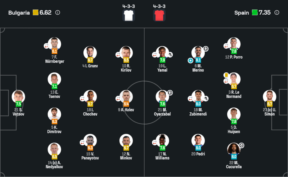 สเปนเล่นด้วยระบบ 4-3-3 ครองบอลเหนือกว่าอย่างชัดเจน การออกบอลจากแดนหลังสู่กลางสนามไหลลื่น Zubimendi และ Pedri เชื่อมเกม ขณะที่ Merino เติมขึ้นสูงสร้างมิติ และ Yamal กับ Williams ฉีกตัวริมเส้นคอยดึงกองหลังเปิดพื้นที่ การเข้าทำของสเปนจึงมีทั้งการยิงไกลและการเจาะพื้นที่แคบ ส่วนบัลแกเรียวางระบบ 4-3-3 เช่นกันแต่แทบตั้งรับตลอด การครองบอลต่ำและความแม่นยำในการจ่ายบอลเพียง 69% ทำให้เสียการครองบอลง่ายและโดนบุกกดดันต่อเนื่อง การเปรียบเทียบนี้ยืนยันว่าในแง่ วิเคราะห์บอล สเปนเหนือชั้นกว่าทุกมิติ