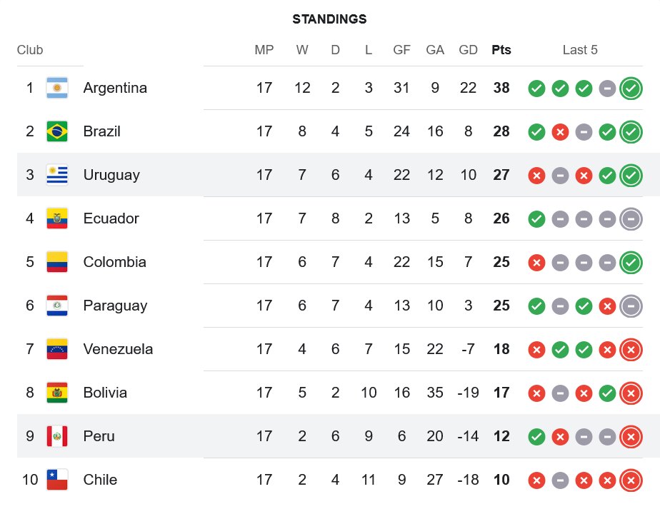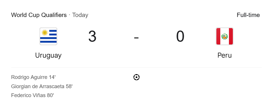 ชัยชนะนัดนี้ทำให้อุรุกวัยเก็บเพิ่มเป็น 27 แต้ม รั้งอันดับ 3 ของตาราง มีลุ้นจบด้วยโควต้าอัตโนมัติไปเล่นฟุตบอลโลก ส่วนเปรูจมอยู่รองบ๊วยอันดับ 9 มีเพียง 12 แต้ม สถานการณ์เข้ารอบยากขึ้นทุกที