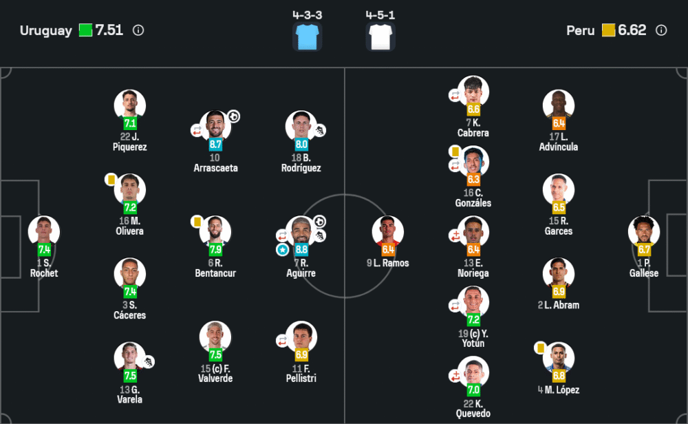 รางวัลนักเตะยอดเยี่ยมตกเป็นของ โรดริโก้ อากีร์เร ที่โชว์ฟอร์มสุดร้อนแรง ยิง 1 ประตู และทำอีก 1 แอสซิสต์ พาเกมรุกอุรุกวัยไหลลื่นทั้งเกม ได้คะแนนสูงถึง 8.8 ถือว่าเป็นหัวใจหลักที่ทำให้ทีมเก็บชัยชนะในวันนี้