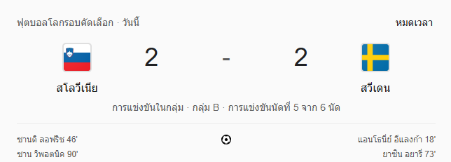 - หมดเวลา: สโลวีเนีย 2-2 สวีเดน – แบ่งแต้มกันไปในเกมที่เต็มไปด้วยคุณภาพและดราม่าในช่วงท้ายเกม